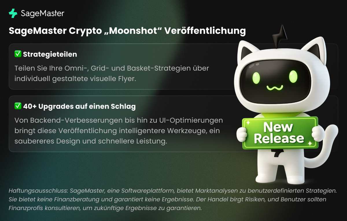 Haftungsausschluss: SageMaster ist eine Softwareplattform, die Markteinblicke zu vom Nutzer ausgewĂ€hlten Strategien bietet. Sie stellt keine Finanzberatung dar und garantiert keine Ergebnisse. Der Handel ist mit Risiken verbunden â bitte ziehen Sie einen Finanzberater hinzu.