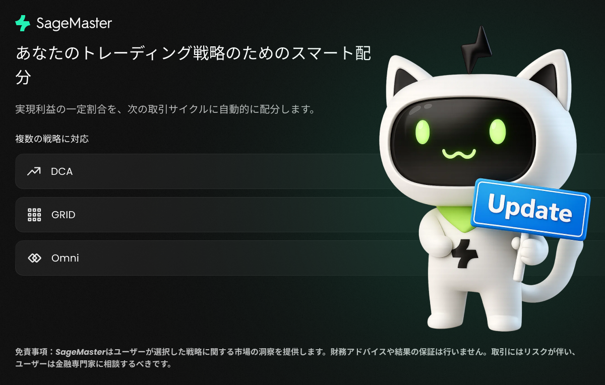 💡 免責事項:Sagemaster はソフトウェアプラットフォームとして、ユーザーが選択した戦略に関する市場インサイトを提供します。金融アドバイスを行うものではなく、結果を保証するものでもありません。トレーディングにはリスクが伴うため、ユーザーは金融の専門家に相談する必要があります。