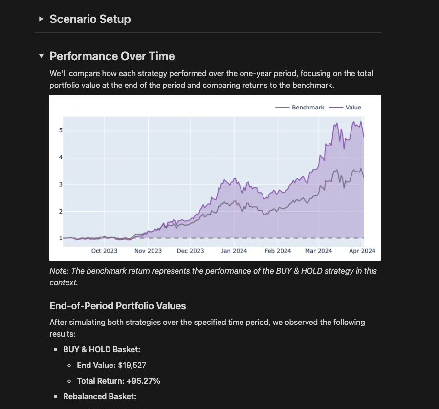 I was looking at the AI basket... in the report of each strategy it would be wonderful to be able to see the difference in portfolio growth with the AI basket compared to the growth of the hold-only wallet, like this one which is in the notion...