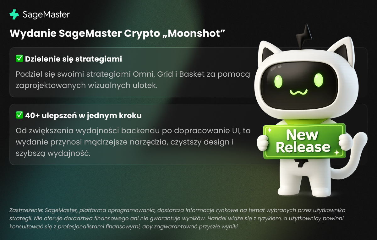 Zastrzeżenie: SageMaster to platforma programowa, która dostarcza wglądów rynkowych na podstawie strategii wybranych przez użytkownika. Nie oferuje doradztwa finansowego ani nie gwarantuje wyników. Handel wiąże się z ryzykiem — skonsultuj się z doradcą finansowym.